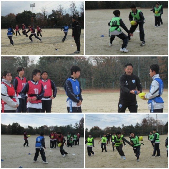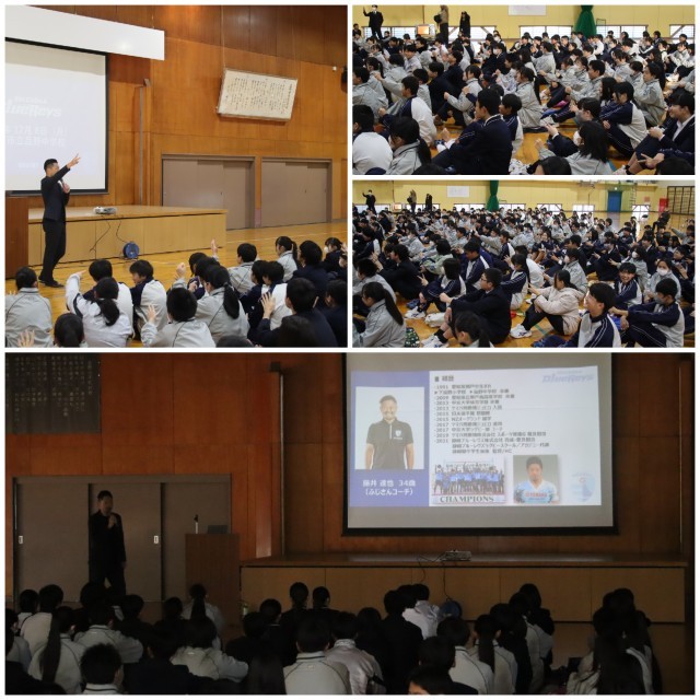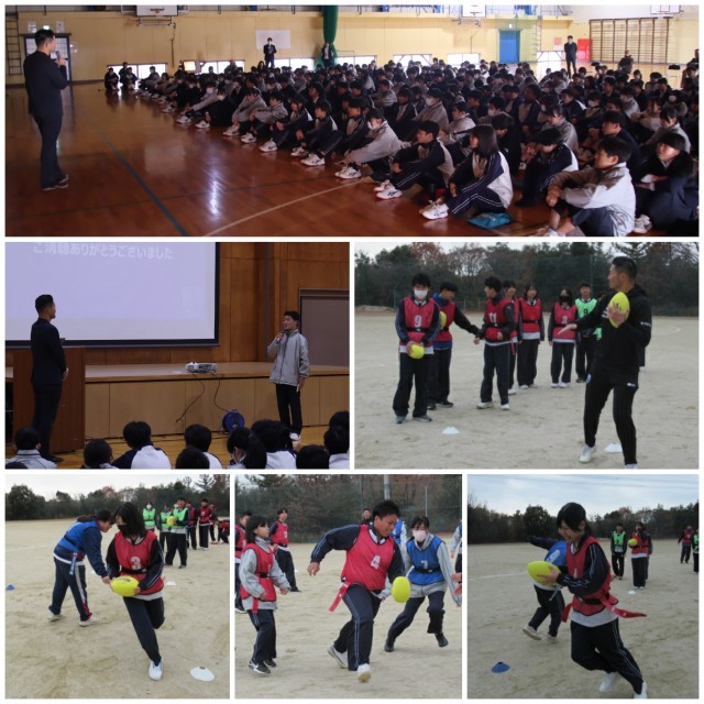 今日の1限は、本校の卒業生の元プロ・ラグビー選手の藤井達也さんに来校していただき、全校生徒に向けてお話をしていただきました。「環境は自分次第」「自分を変えるためには『考え方』+『行動』が大切だ」という言葉がとても印象的でした。2~4限目は2年生にタグラグビーを教えていただきました。最初は遠慮しながらやっていましたが、藤井さんの情熱的な指導で汗をかくほど楽しんで運動することができました。藤井さん、今日は本当にありがとうございました。