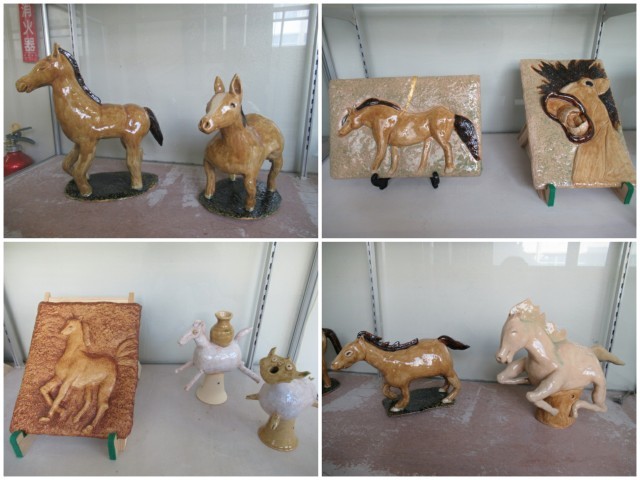 窯で焼き上げた作品を、玄関のギャラリーに展示しました。A組のみなさんが交流会等で作った作品と、美術窯業部のみなさんが作った干支の馬です。とても素敵です。