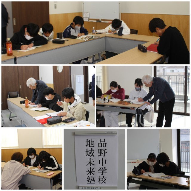 コミュニティスクール主催で、下品野地域交流センターをお借りし、日曜日に第1回の地域未来塾(勉強会)が開かれました。テスト勉強の道具をもって、14名の1・2年生が参加しました。元教員の方や大学生の方にも質問できる、とてもありがたい会です。地域のみなさん、これからもよろしくお願いします。