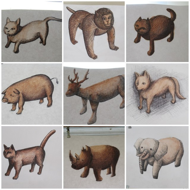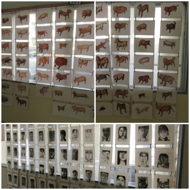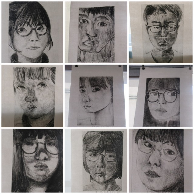 1年生は、自分の顔をドライポイントの版画で表現しました。2年生は、陶器で作った動物をもとに絵で表現しています。どの作品も個性があふれていて、とても素敵な雰囲気です。 -