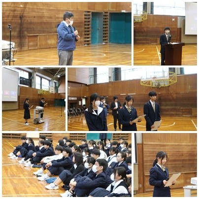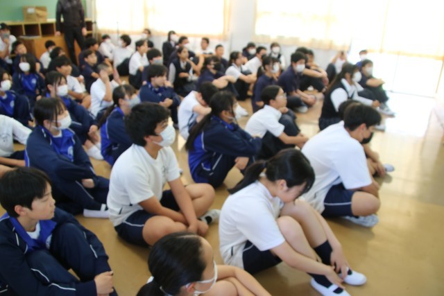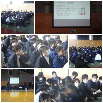 市役所の市民生活部コミュニティー推進課をお招きし、消費生活講座を受けました。中学生でも巻き込まれやすいトラブルとしてネットショッピングやオンラインゲームの危険性を教えていただきました。