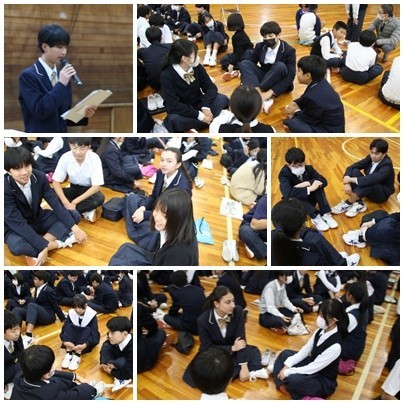 本日の全校集会は、人権週間にちなんで人権について考えました。人権作文を聞き、4人組になり感想を話し合いました。全校でいじめについて真剣に考えることができました。