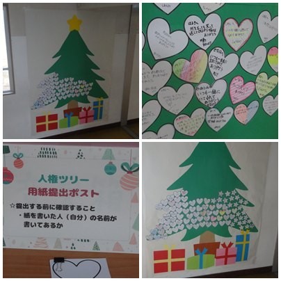 12月4日から人権週間が始まります。月曜日の集会で生徒会から、人権ツリーを作って「ありがとう」など友だちに自分の思いを伝え、学校中が温かい雰囲気になるような活動をしようと提案がありました。早速見に行くとたくさんの「ありがとう」の実がたくさんなっていました。どんどん実が育ち、プラスの言葉が溢れる温かい学校にしましょうね。