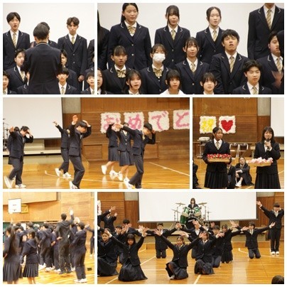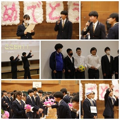 今日は、卒業生を送る会を行いました。まずは、生徒会企画で先生クイズを行いました。次に各学年のアトラクションでした。A組は「あたりまえ体操」光陵中バージョン、1年生は3年生の先生ものまねと花束贈呈、2年生は合唱、3年生はダンスと全校を巻き込んでのジャンボリミッキーを披露しました。最後に全校合唱を行いました。どの学年も活躍するとても温かい雰囲気の会になりました。