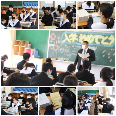 1年生の教室の黒板には、3年生による素敵な歓迎の絵が描かれています。
