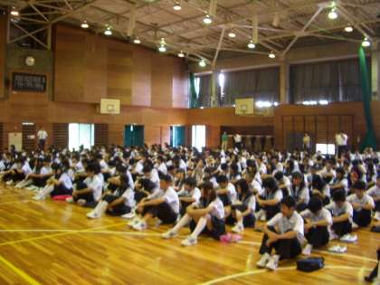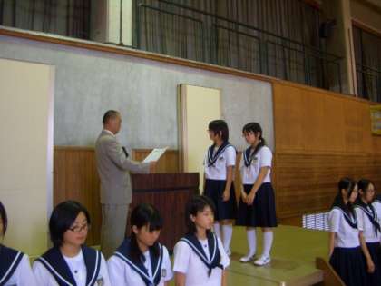 残暑厳しい中,2学期がスタートしました。校長先生からは,各部活動の夏の大会・コンクールでの頑張りや活躍の話のほか,2学期に予定されている体育祭・文化祭などの大きな行事への意気込みを感じることができる話がありました。充実した2学期を送ることができるように,家庭での励ましもよろしくお願いいたします。(写真は部活の表彰風景など)