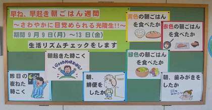 「早寝 早起き 朝ごはん週間」 公開日 2013/09/09 更新日 2013/09/09 学校の様子 今週は、保健委員会の呼びかけにより「早寝 早起き 朝ごはん 週間」運動の取組が行われています。「さわやかに目覚められる光陵生!!」をキャッチフレーズに生活リズムチェック等が行われます。2学期が始まってはや1週間・・・。生活リズムを安定させ、学習に運動に励み、有意義な2学期としたいものです。 いいね(0)