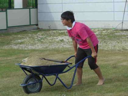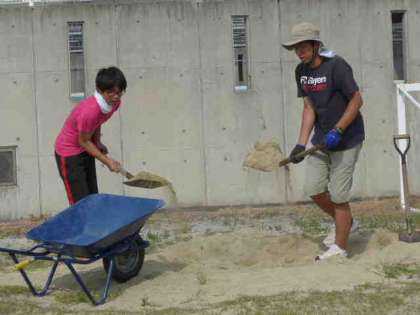 卒業生が芝生整備のボランティア