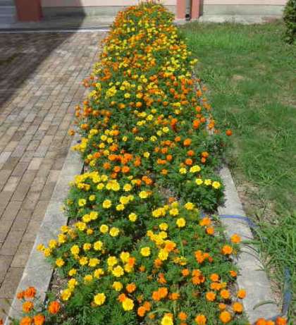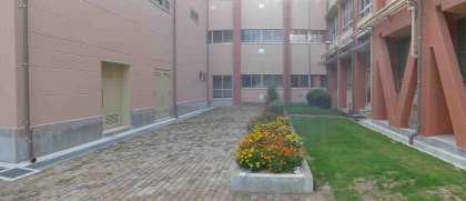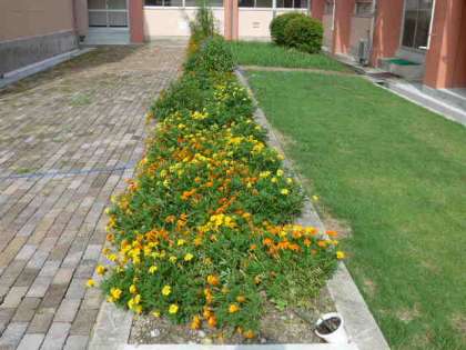 スロープ棟が建設されたため、中庭はかつての半分ほどの大きさになっています。レンガを敷き詰めたエリアと芝生を貼ったエリアを花壇が分けています。