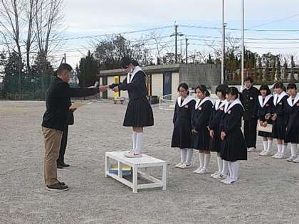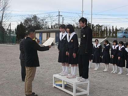 その後、学校長より、中学校生活最後の集会に臨んだ3年生に、卒業まで残り少ない期間でも有終の美を飾るよう1日1日を大切にすること、1・2年生には、その姿をしっかり目に焼き付けて後を追いかけていくことについて、話がありました。