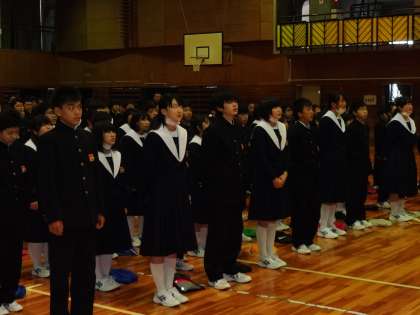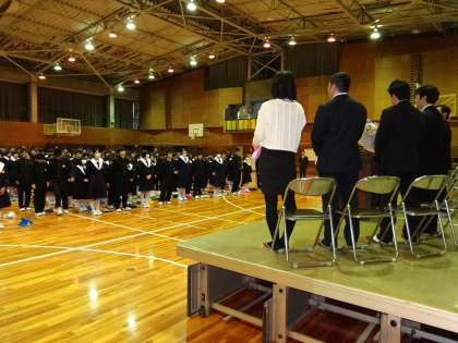 お世話になった先生方へ 公開日 2015/04/13 更新日 2015/04/13 学校の様子 ひとり一人ご挨拶をしていただいた後、花束を贈り、全校生徒から校歌のプレゼント。 心のこもった校歌斉唱でした。1年生も歌っている生徒がいました。 いいね(0)