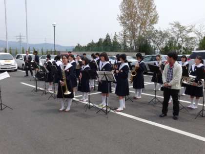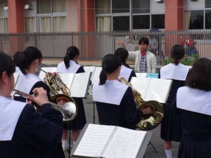 スプリングコンサート 公開日 2015/04/16 更新日 2015/04/16 学校の様子 吹奏楽部が昼休みの時間に「スプリングコンサート」を開きました。場所は、さくらんぼ学園のウッドデッキの前で演奏をしました。さくらんぼの生徒や光陵中の生徒たちが見事な演奏に聴き入っていました。 いいね(0)