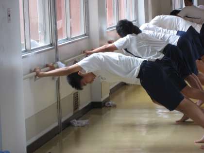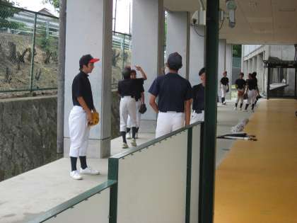 久しぶりに本格的な雨が降り、校外で活動ができないラグビー部は、廊下で筋力トレーニングをしていました。野球部は柔剣道場前の雨の当たらないスペースで活動していました。
