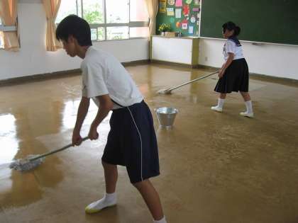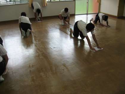 床を磨いた後、ぞうきんがけをし、水分を拭き取ります。最後の仕上げとして、美化委員がワックスをかけます。一晩、乾燥させ、明日の朝、机や椅子を室内に戻します。