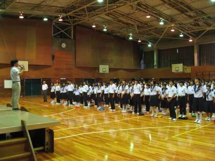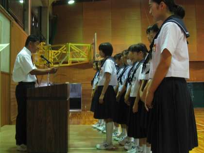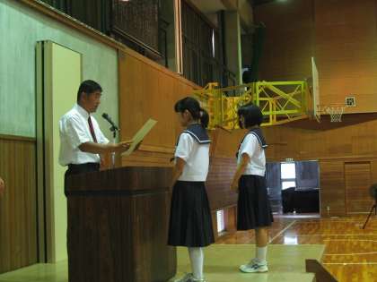 式の前に、校歌の練習をしました。やはり式の中でいきなり歌うのと、練習してからでは声の大きさが違います。また、先週の土曜日日曜日に行われた中総体の表彰がありました。バスケットボール部女子と卓球部女子個人戦の伝達表彰でした。卓球部は7月23日に行われる愛日大会に出場します。
