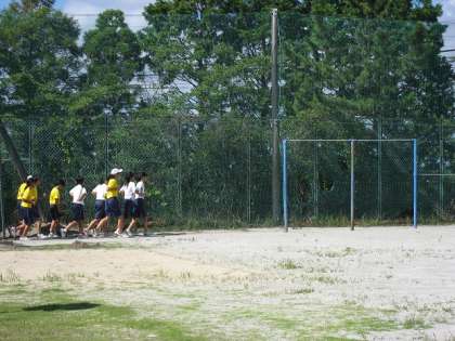 今朝、運動場ではテニス部が声をかけながらランニングをしていました。