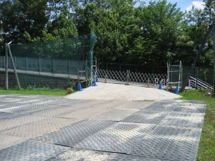 体育館の天井や屋根の補修工事が8月8日(土)から本格的に行われます。その工事に備え、体育館東側の柵を一部撤去し、車が出入りできるようにしてあります。また、足場が組まれたり、破片や音で周りの迷惑を減らすようにカバーが掛けられたりしています。