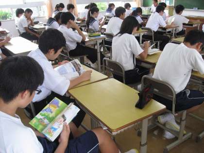 登校して荷物を整理した後、朝読書の時間になっています。