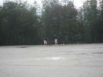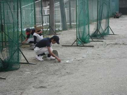 今朝、野球部は水たまりのできたグランドの整備をしていました。