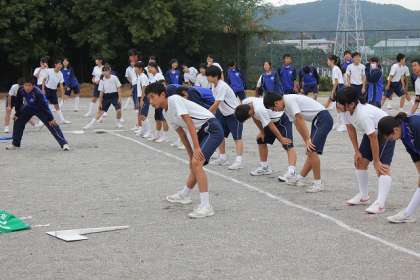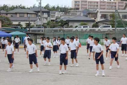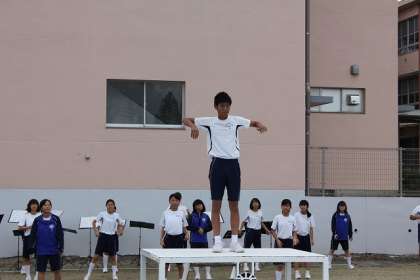 開会行事の最後に準備運動を行いました。指示は体育委員会の委員長が行いました。
