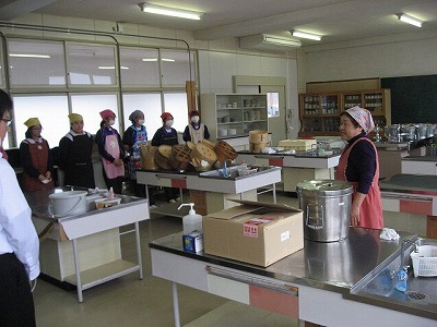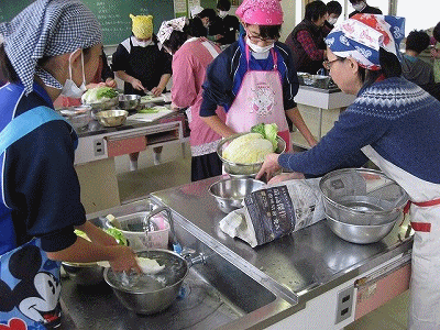 明日の餅つき大会に向けて2年生の餅つき大会実行委員が、少年センターの方々の指導を受けながら、もち米を研いだり、きなこと砂糖をあわせたり、つけものを作ったりしました。