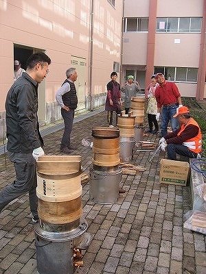 かまどは中庭に設置しました。始まる2時間以上前から、火とお湯の準備を始めました。セイロに一晩水に浸した餅米をいれ、40〜50分蒸し、餅つきができる状態になるのを待ちます。大きなセイロですので、1つのセイロの中には餅米が3キログラムほど入っており、ちょうど餅つき1回分の量になっています。