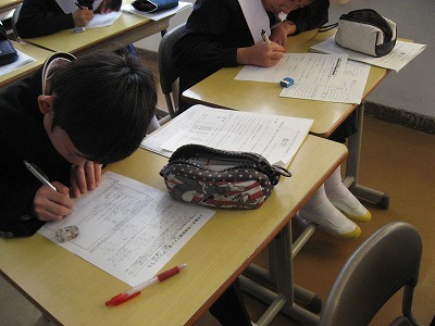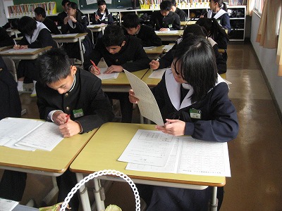 写真は2年生の数学で返却し、解説の後、やり直しプリントに取り組んでいる時の様子です。