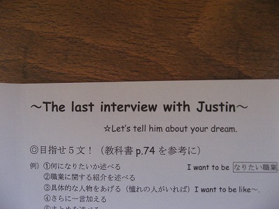 3年英語ALTラストインタビュー 公開日 2016/02/08 更新日 2016/02/08 学校の様子 3年生の英語では、ALTの先生と1対1でインタビューをする時間を設定しています。英語で、将来の夢や自分の興味があることを話し、質問を受けます。 3年生にとっては、これがALTの先生の授業を受ける最後になります。 いいね(0)
