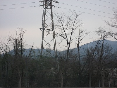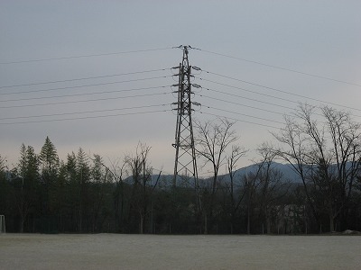 運動場東フェンス外に送電線があります。その周りの木が大きくなって電線にかかるといけないので、伐採を中電の方がされました。