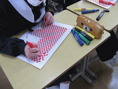 学年末テストが終わった12年生は、4時間目から卒業生を送る会に向けて、モザイク画の制作にかかりました。一人一人ではどんな絵が完成するか全くわかりません。決められた色で枠を塗っていきます。一番下の写真は以前の送る会で作成されたモザイク画です。