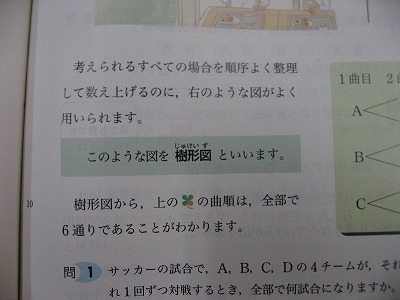 以前サイコロを振る実験をして確率を求めました。具体的な問題には「樹形図」とよばれるものを使って求めます。10円玉を同時に3枚投げるときの出方は全部で何通りあるかを、樹形図を使って考えました。