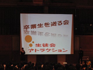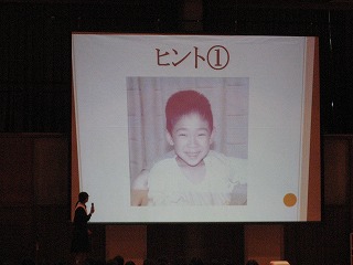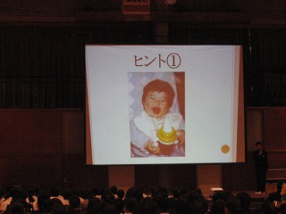卒業生を送る会その2 公開日 2016/03/01 更新日 2016/03/01 学校の様子 開会行事の後、生徒会によるアトラクションです。最初は、クイズです。 「だれでしょう?」小さい頃の写真から誰かを当てます。 正解は3年生の担任の先生方でした。 いいね(0)