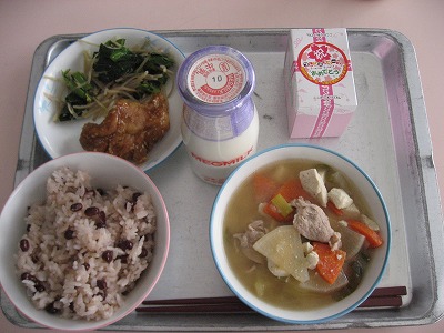 3年生にとっては今日が中学校生活最後の給食でした。高等学校へ進んでも、就職しても給食を食べることはほとんどなくなります。ひょっとしたら人生最後の給食になる生徒もいるかもしれません。メニューには、赤飯、ケーキの他、人気の最も高い「鶏肉のてりかけ」でした。