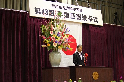 校長式辞の後、教育委員会告辞(教育委員様)、瀬戸市長祝辞(瀬戸市消防長様)の順に、お祝いのことばをご来賓からいただきました。