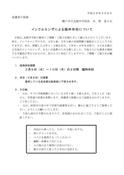 インフルエンザによる臨時休校のお知らせ(3月8日)