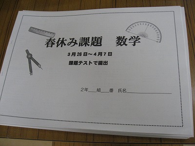3月17日(木)の予定 公開日 2016/03/16 更新日 2016/03/16 連絡・お願い ● 45分日課 ● 簡単清掃 ● 公立高校合格発表 ■ ALT来校日 ■ 市ポルトガル語語学相談員来校日 明日は3年生公立高校の合格発表日です。良い結果がでることを祈っています。 写真ですが、2年生の春休みの課題です。 いいね(0)