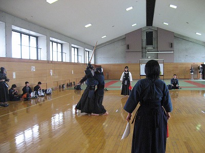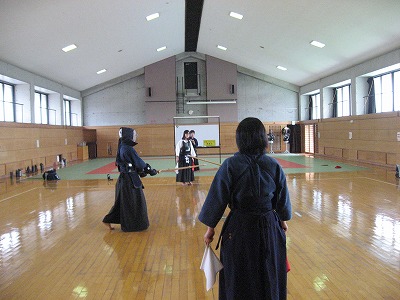 柔剣道場では剣道部が試合形式の練習をしていました。審判も生徒同士で行っていました。