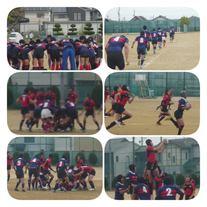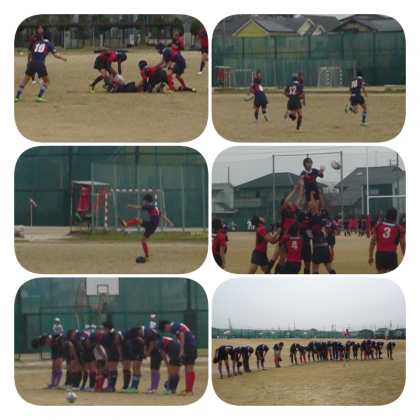 ラグビー第14回イーストリーグ決勝トーナメント1回戦が、旭野高校を会場にして行われました。本校は、幡山中学校との合同チームで参加し、水野中学校と対戦しました。前半は、1トライをあげたものの5対10でリードされる展開となりました。後半すぐにトライをあげ、ゴールも決まって12対10と逆転し、その後も3トライ2ゴールを決め、見事31対10で勝利しました。選手の皆さんよくがんばりました。次の試合も期待します。