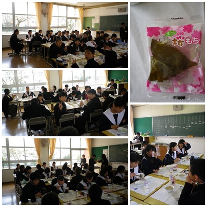 給食初日(4月12日) 公開日 2016/04/12 更新日 2016/04/12 学校の様子 今日が給食の初日でした。準備も滞りなく行うことができました。デザートとして桜もちがでました。今日はスクールカウンセラーさんの来校日で、1年1組で会食をしました。 いいね(0)
