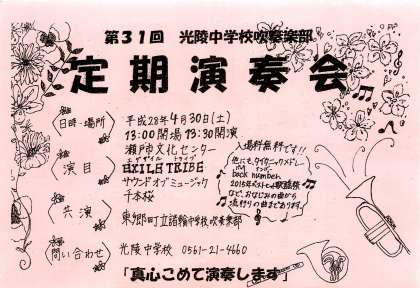 吹奏楽部定期演奏会のご案内 公開日 2016/04/28 更新日 2016/04/28 学校の様子 4月30日(土)文化センターにて、13:00開場、13:30開演で、吹奏楽部の定期演奏会を行います。東郷町の諸輪中学校吹奏楽部が共演です。 お時間があれば、文化センターに是非お越しください。 いいね(0)