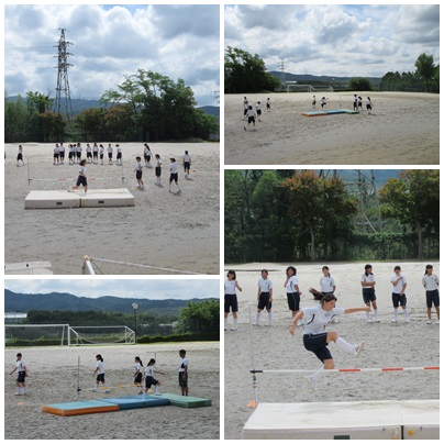 今日の体育は男子が体育館でバレーボール、女子は運動場で陸上(走り高跳び)を行っています。男子は試合をやっていました。