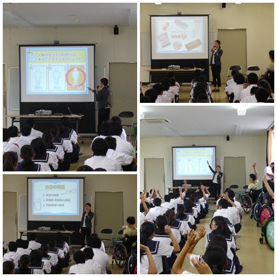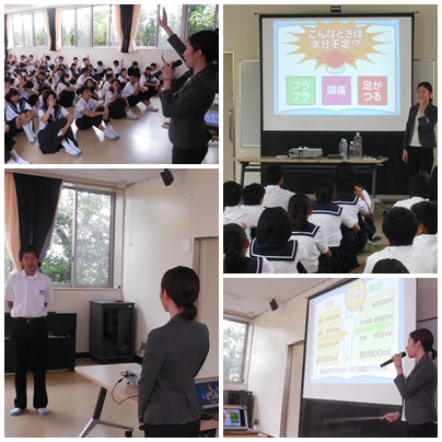 「見直そう!水分補給」をいうテーマで授業を行っていただきました。さくらんぼ学園の生徒さんも一緒に受けました。