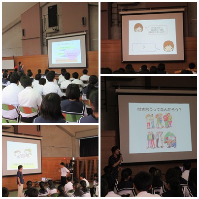 2年生を対象に、大学から講師をお招きし性教育講座を行いました。講師の先生から「がんばって生まれてきた命」「思春期のこころとからだの特徴」「男女交際とデートDV」などについて、途中、事前にとったアンケート結果をしめしたり、交際について事例をもとにしたディスカッションを交えたりして、ていねいにお話していただきました。