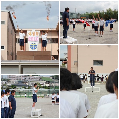 雨天のため一度も運動場では練習できない状態での開会式式でした。聖火点火、校長の話、生徒会長の話、選手宣誓などがありました。