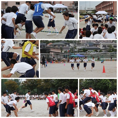 体育祭その10(9月15日) 公開日 2016/09/15 更新日 2016/09/15 学校の様子 競技の8番目は2年生の「進め!ハリケーン」でした。4人で棒を持ち、コーンを回ってもどってきます。その棒を全員で飛び越え、次の4人につなぎます。 いいね(0)