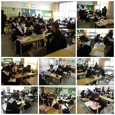 期末テストが来週にあります。期末テストを控えて、3年生は昼放課に互いに教え合ったり、問題を出し合ったりしながら期末テストの勉強をしています。先生に質問をしている人もいます。友達にていねいに教えている人も見かけます。