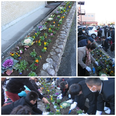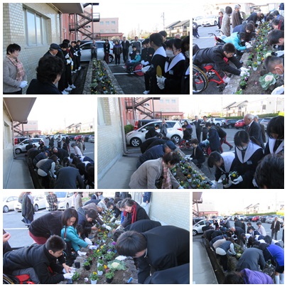 光陵中学校の生徒、さくらんぼ学園の生徒、面接指導にきていただいている地域の方の三者で、来賓玄関前の花壇にパンジー、葉ボタンなどの苗やチューリップの球根を植えました。