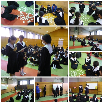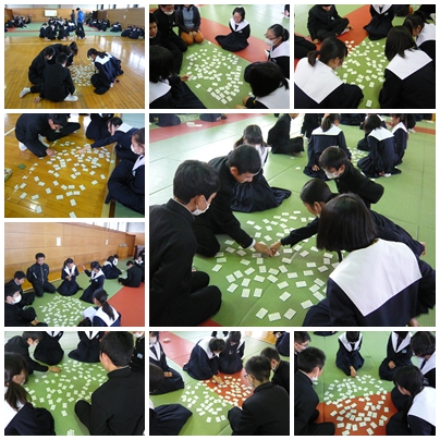2年生学年レク常盤杯(12月9日) 公開日 2016/12/09 更新日 2016/12/09 学校の様子 2年生は、6時間目に学年レク常盤杯を行いました。柔剣道場での百人一首大会でした。二人一組のチームを作り、3クラスでの対抗戦となるよう3チーム6人で1グループを作って対戦していました。札を取る度にそれぞれのグループから歓声があがり、大変盛り上がった百人一首大会になりました。最後に優勝クラスとMVPチームが表彰されました。 いいね(0)