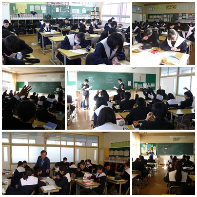 1年生の授業(12月14日) 公開日 2016/12/14 更新日 2016/12/14 学校の様子 2時間目の1年生の授業は、1組国語、2組数学、3組理科の授業でした。1組国語の授業では、漢字の小テストを行っていました。2組の数学の授業では、計算練習の小テストを行ったあと、答え合わせのための発表をしていました。3組の理科の授業では、光の進み方について、作図を使って学習していました。作図の書き方について、周りの席の生徒と相談しながら作業を進めていました。 いいね(0)