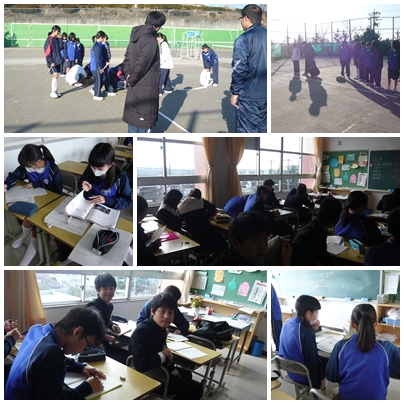 部活動が本格的にスタートしました。バスケットボール部は、本日1日練習を行っています。柔剣道場では、剣道部が冬休みの課題のチェックと今年1年の目標の書初めをしました。ソフトテニス部は、コートラインの張替と初打ちをしました。野球部は、本山中学校で3校合同練習を行いました。